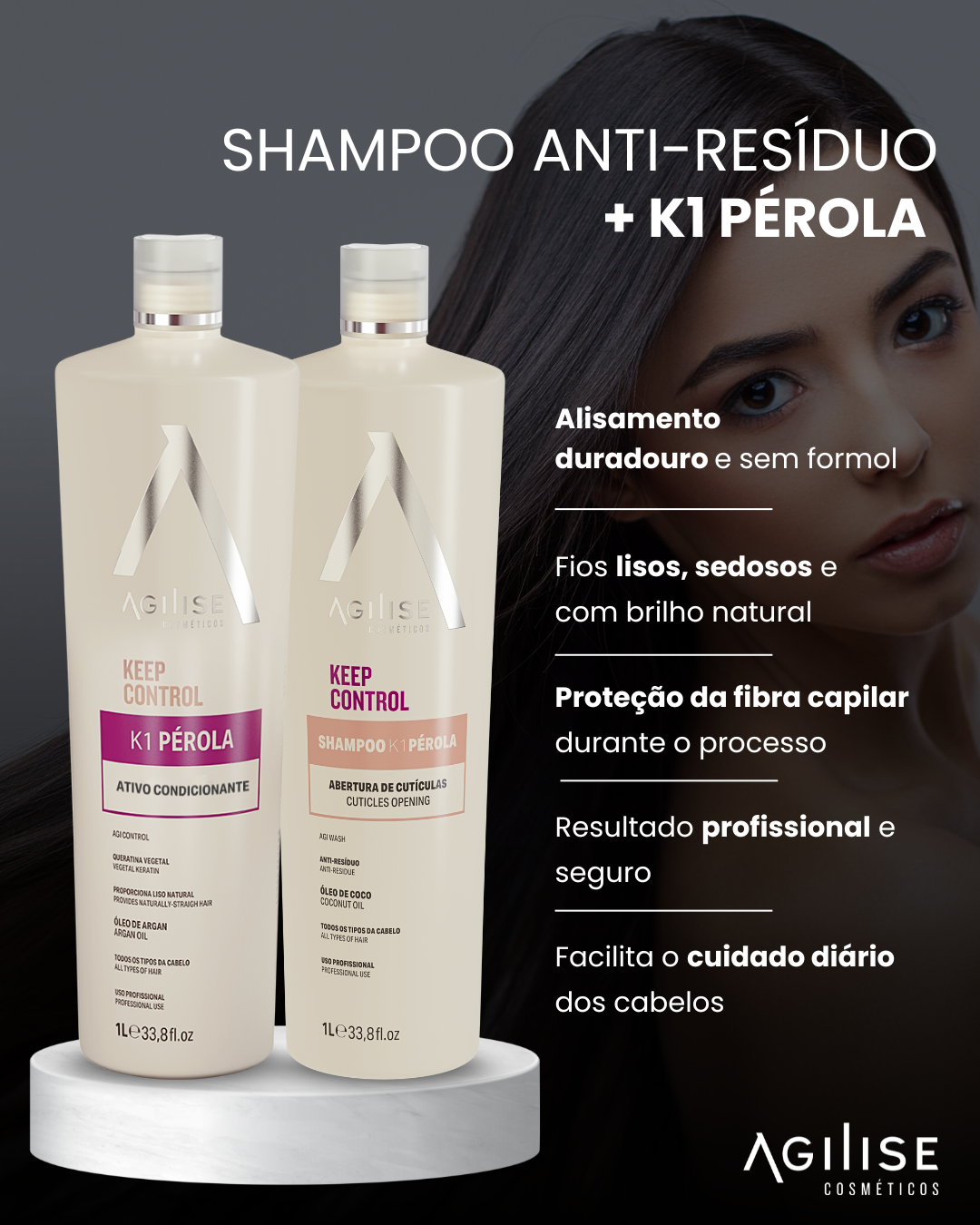 O kit é composto por: Shampoo Anti Resíduo 1L e Alinhamento K1 Pérola 1L.