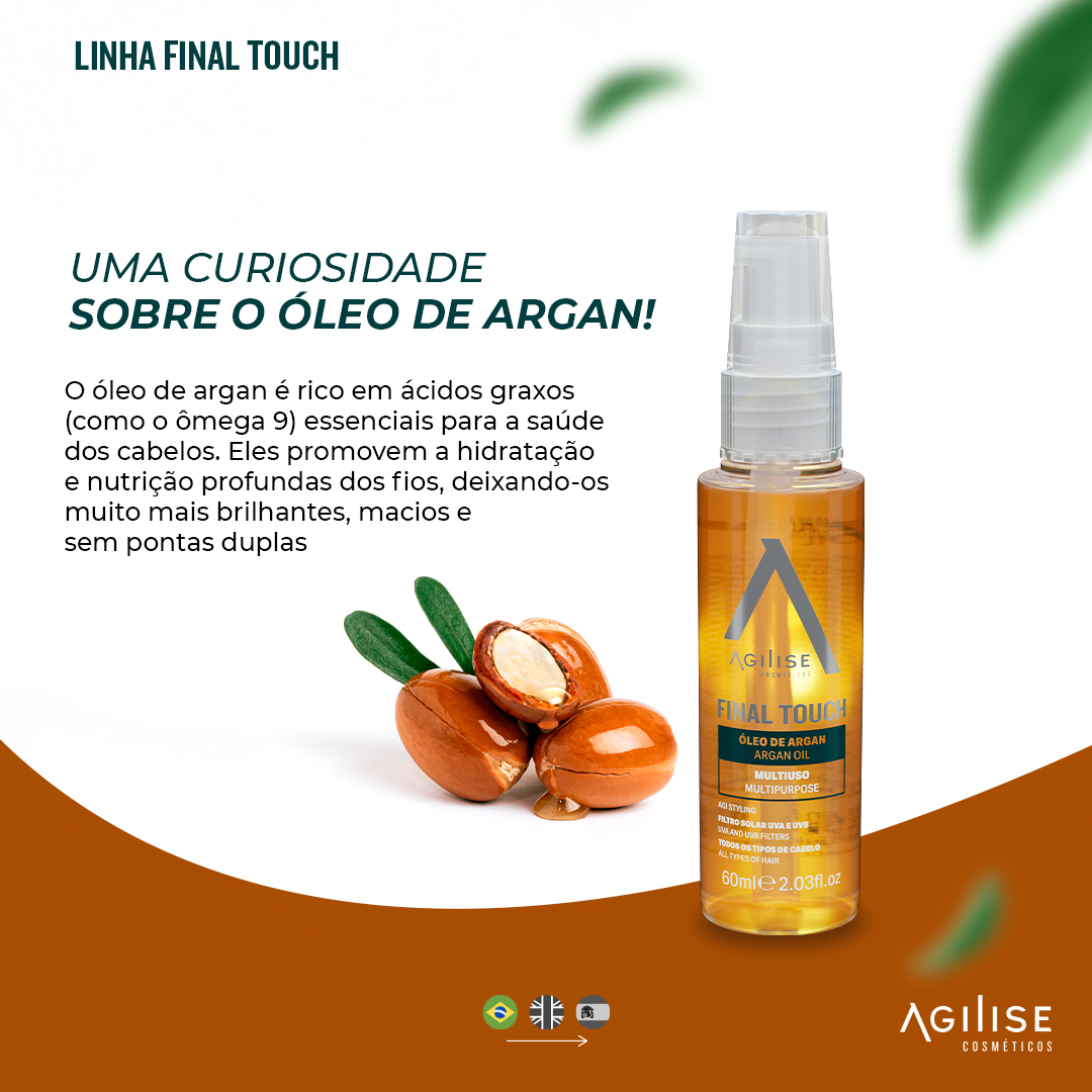 Com os cabelos limpos, aplique uma pequena quantidade do Óleo de Argan na palma da mão e espalhe pelos cabelos, sem enxágue.