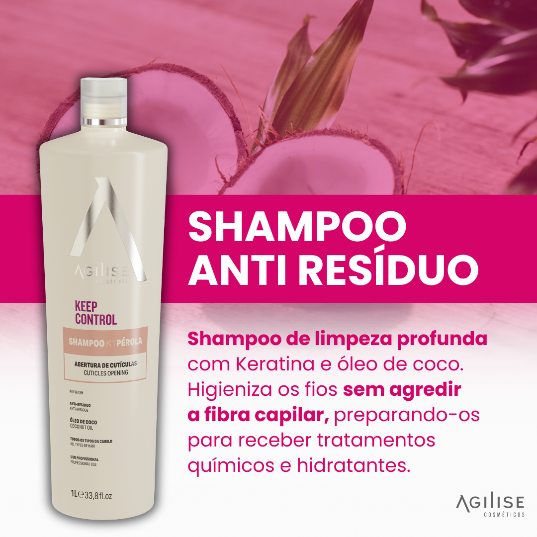 Com os cabelos úmidos, aplique o shampoo anti-resíduo K1 Pérola, massageando suavemente toda a extensão dos fios e enxágue completamente, repetindo a aplicação caso necessário.